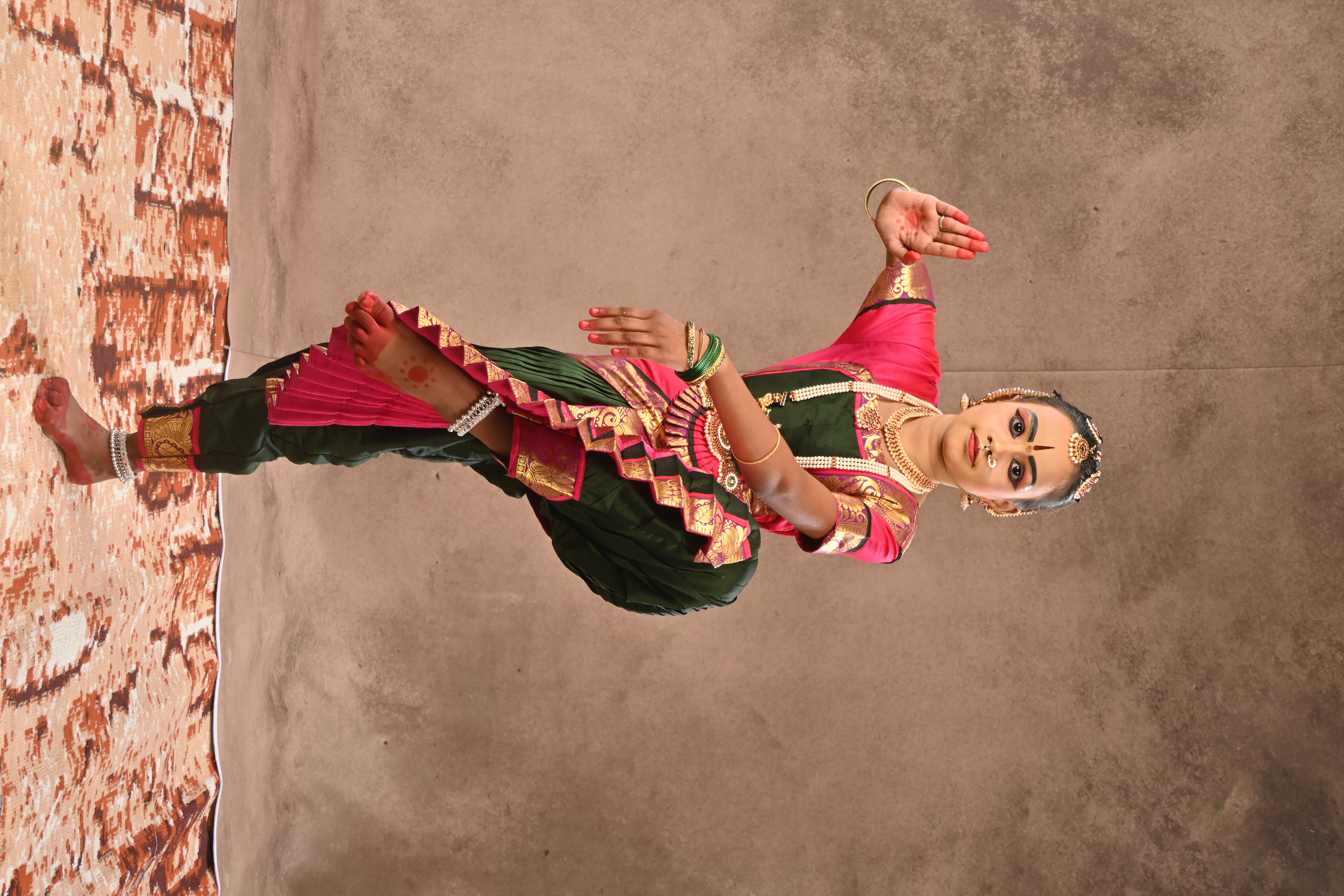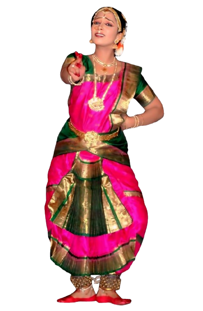 Bharatanatyam contains different types of bani. Bani, or "tradition", is a term used to describe the dance technique and style specific to a guru or school, often named for the village of the guru. Bharatanatyam style is noted for its fixed upper torso, bent legs, and flexed knees (Aramandi) combined with footwork, and a vocabulary of sign language based on gestures of hands, eyes, and face muscles.[7] The dance is accompanied by music and a singer, and typically the dancer's guru is present as the nattuvanar or director-conductor of the performance and art. The performance repertoire of Bharatanatyam, like other classical dances, includes nrita (pure dance), nritya (Conveys a meaning to the audience through hand gestures) and natya (Consists of the elements of drama).[9][10] A program of bharatanatyam usually lasts two hours without interruption and includes a specific list of procedures, all performed by one dancer, who does not leave the stage or change costume. The accompanying orchestra—composed of drums, drone, and singer—occupies the back of the stage, led by the guru, or the teacher, of the dancer.